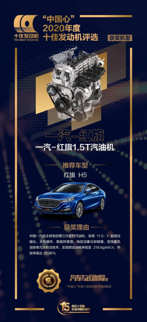 Hongqi 1.5T շարժիչը 2020 թվականին նվաճեց «China Heart» թոփ 10 շարժիչի տիտղոսը